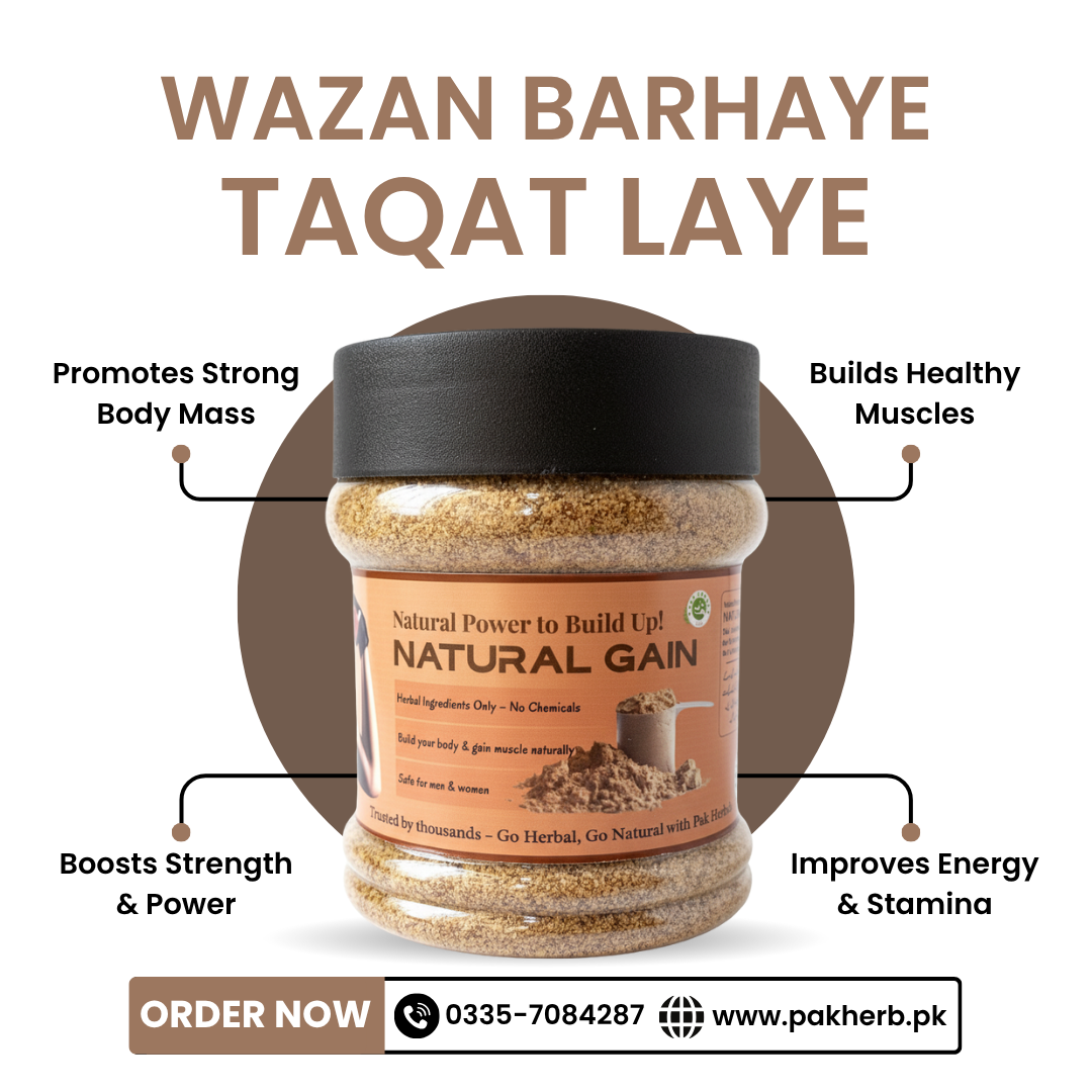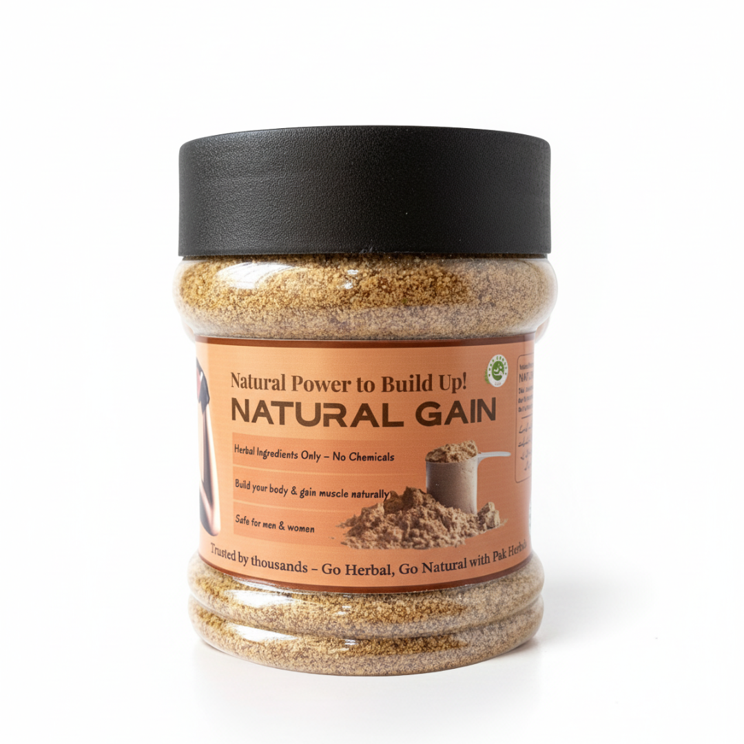 Natural Gain ek 100% qudrati herbal blend hai jo jism ko naturally wazan aur taqat deta hai. Ye powder haddiyo ko mazboot karta hai, phatto ko strong banata hai aur stamina ko improve karta hai. Iska rozana istemal dimagh aur ankho ki taqat ko barhata hai, neend behtareen banata hai aur aapko din bhar active rakhta hai.